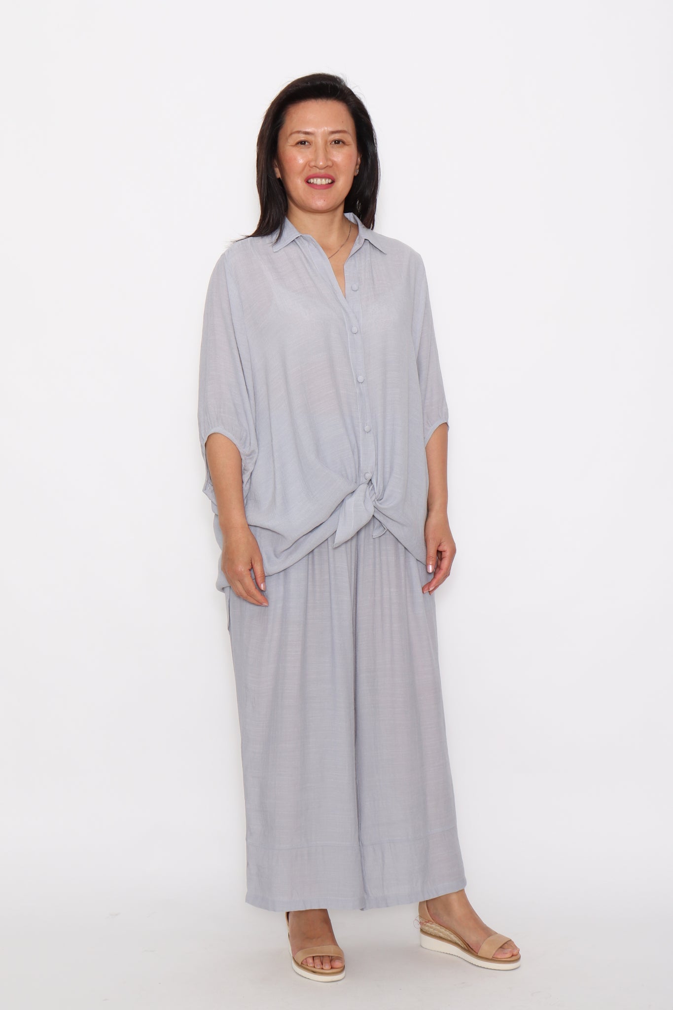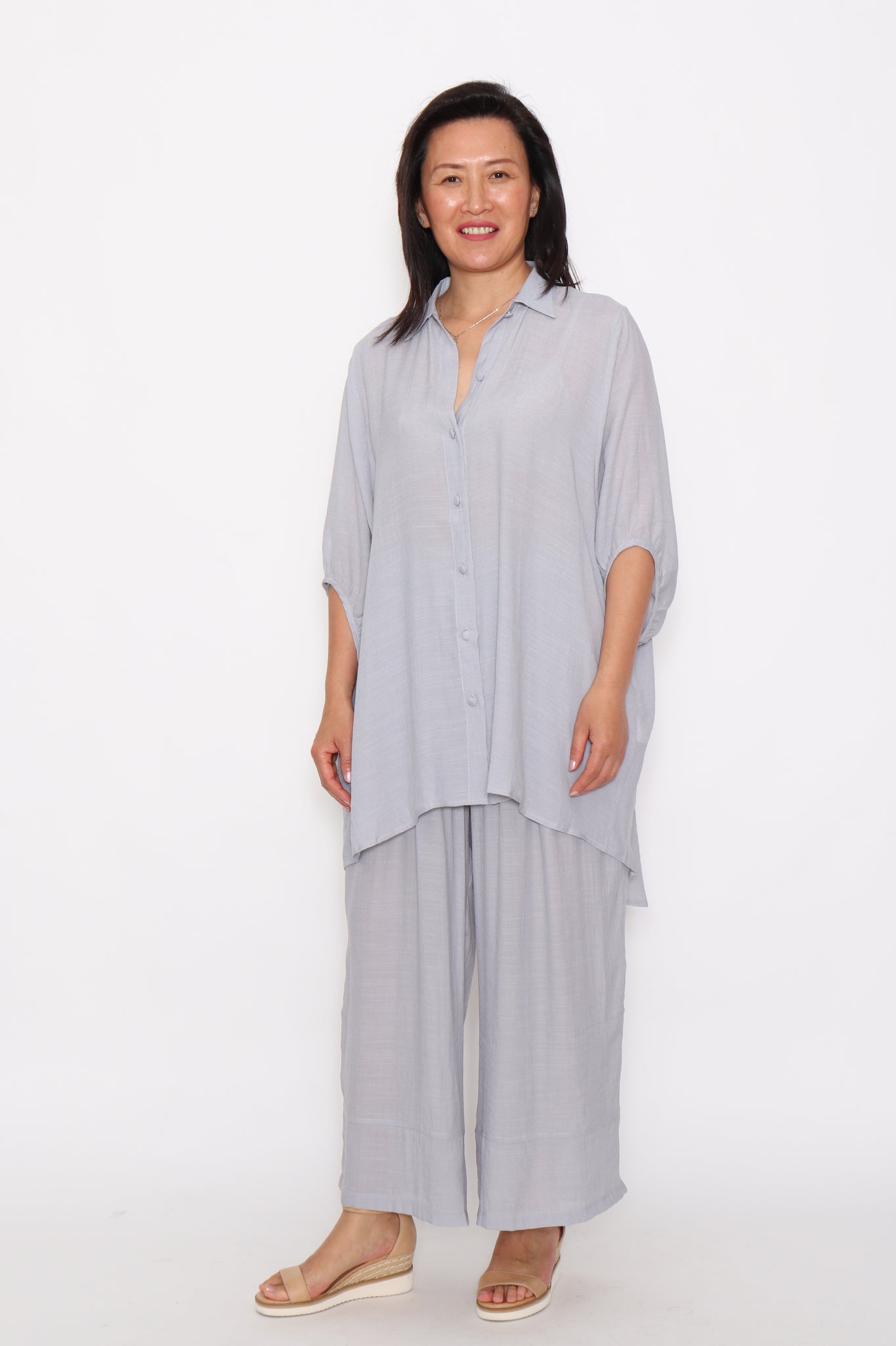 The oversized button-up shirt features a classic collar, flowing silhouette, and relaxed sleeves that create an easy, stylish shape. Paired with matching wide-leg pants, this set delivers a coordinated look that is both flattering and incredibly comfortable.