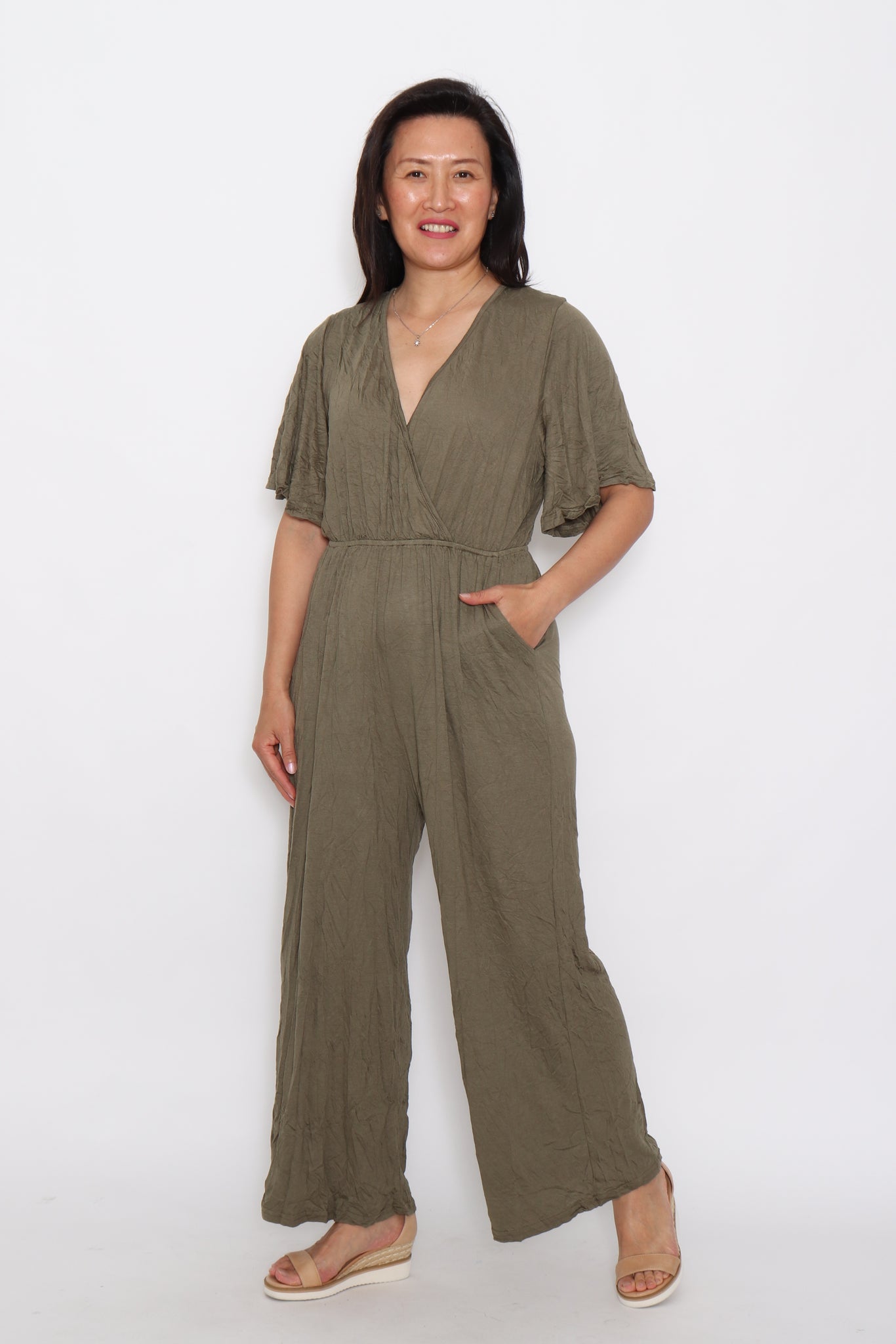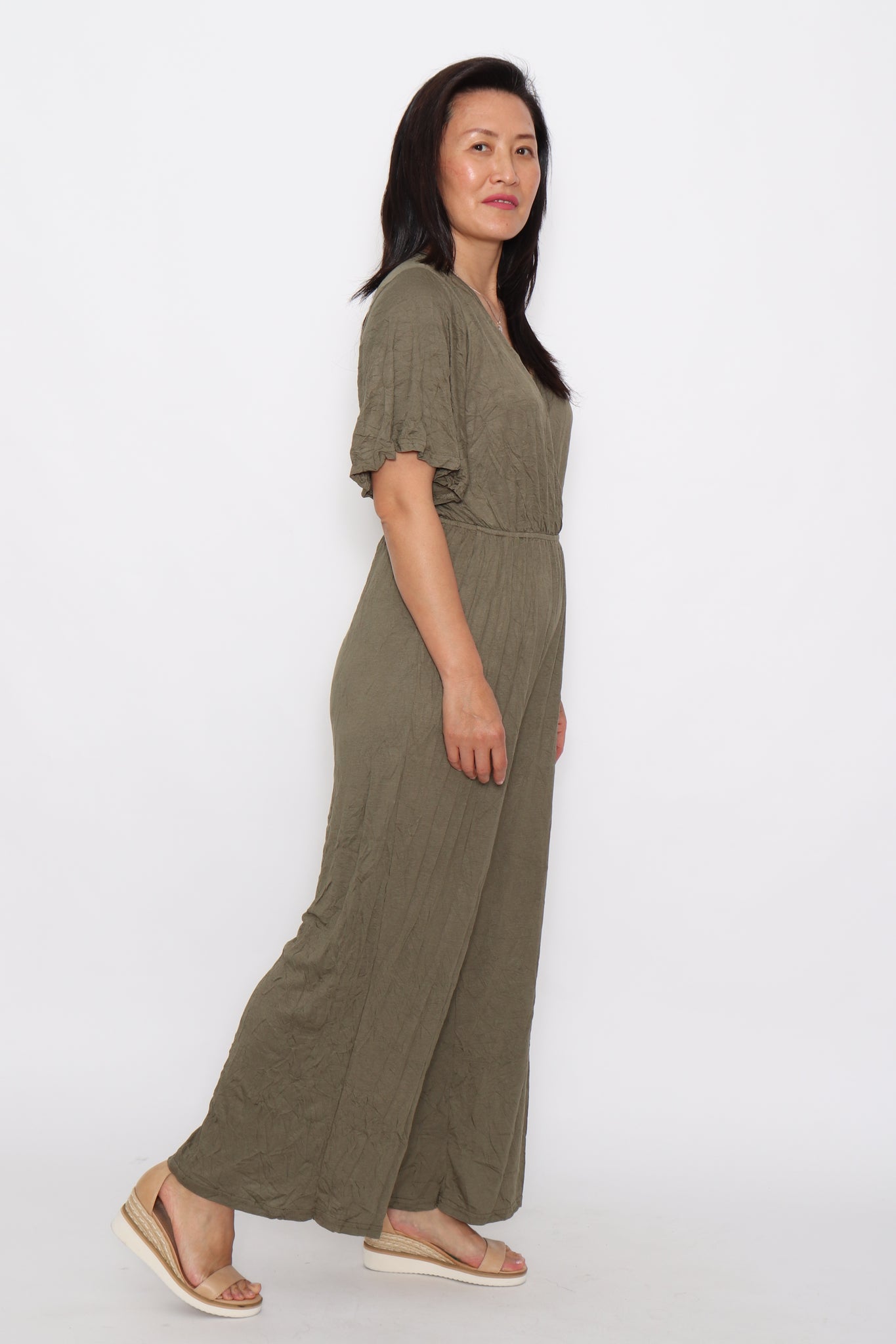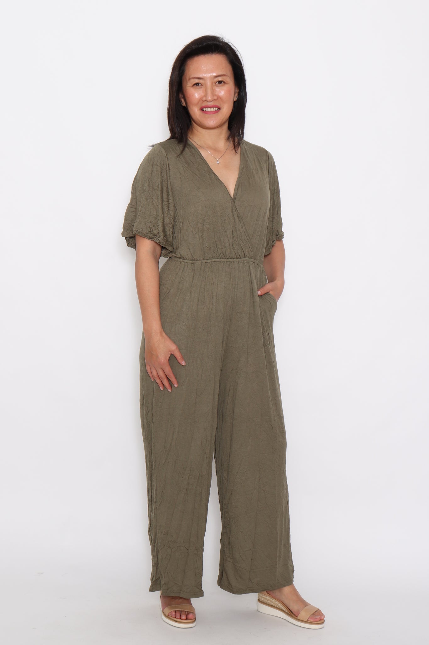 Effortless style meets everyday comfort in this relaxed khaki jumpsuit. Designed with a soft, crinkled fabric that drapes beautifully, this piece offers a flattering silhouette with a deep V-neckline and elastic waist for an easy, comfortable fit. The wide-leg design and short, loose sleeves create a breezy, laid-back look perfect for any occasion.