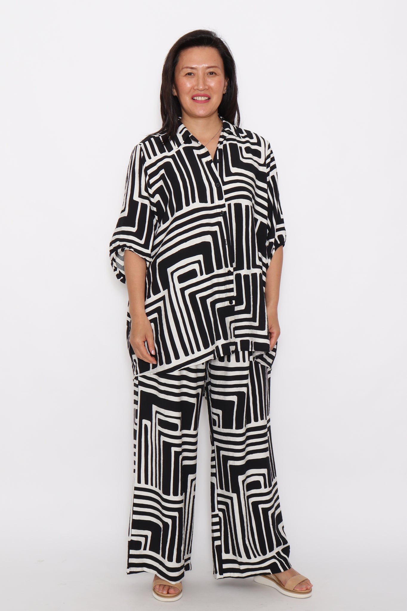 Make a bold statement with this effortlessly chic two-piece set featuring an eye-catching black and white geometric pattern. The relaxed, oversized shirt pairs perfectly with wide-leg trousers for a look that’s both modern and comfortable.