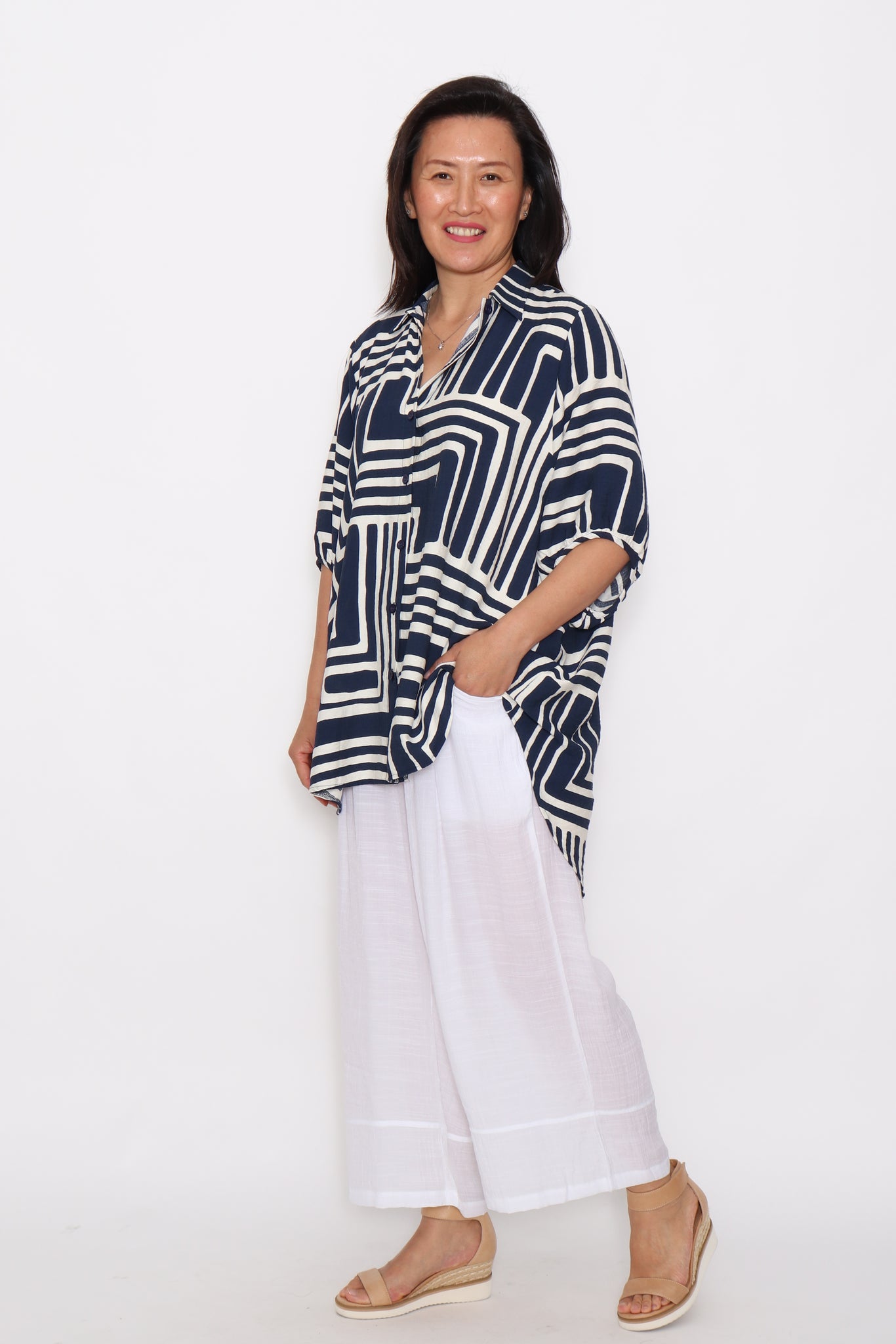 Make a bold statement with this effortlessly chic two-piece set featuring an eye-catching Navy and white geometric pattern. The relaxed, oversized shirt pairs perfectly with wide-leg trousers for a look that’s both modern and comfortable.