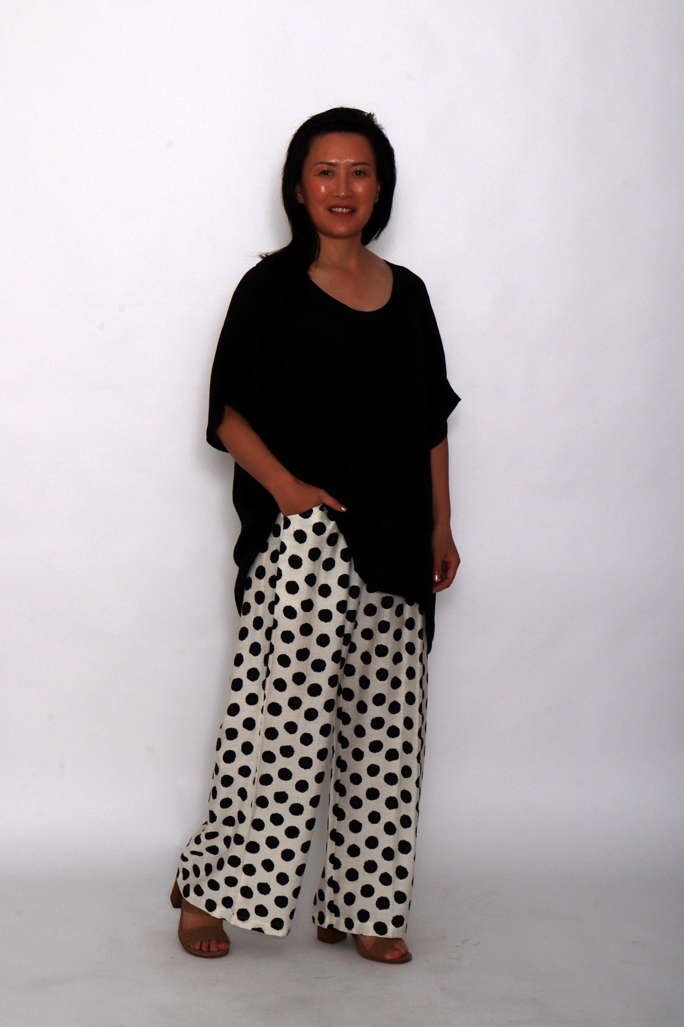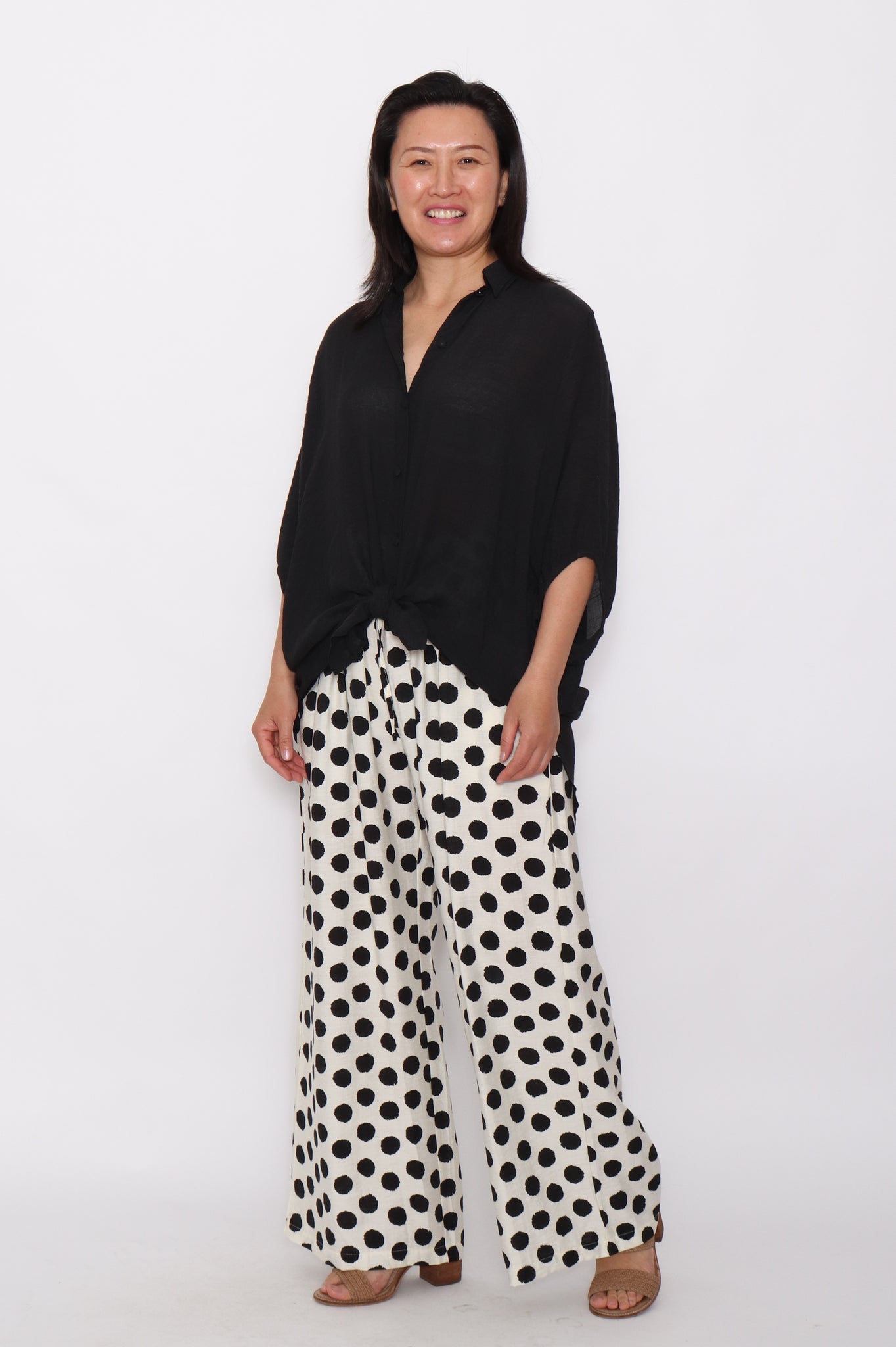 Effortless and playful, this two-piece set pairs a flowy black V-neck top with wide-leg trousers in a bold black polka dot print on a cream background. The oversized silhouette and lightweight fabric create a chic yet comfortable outfit, perfect for casual outings, travel, or relaxed weekends. A versatile look that balances minimalism with fun, statement style.