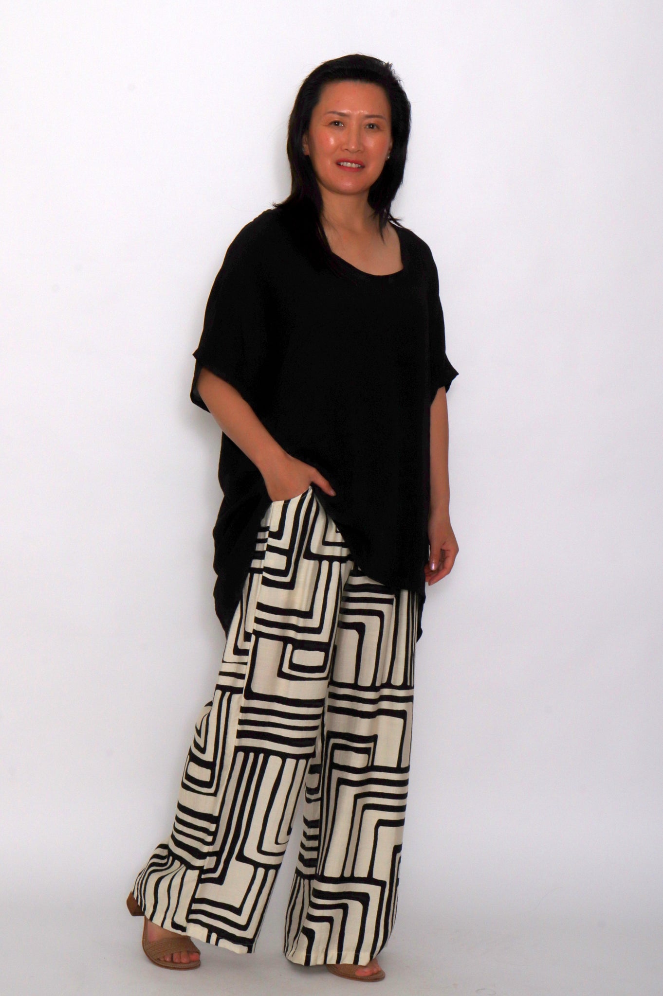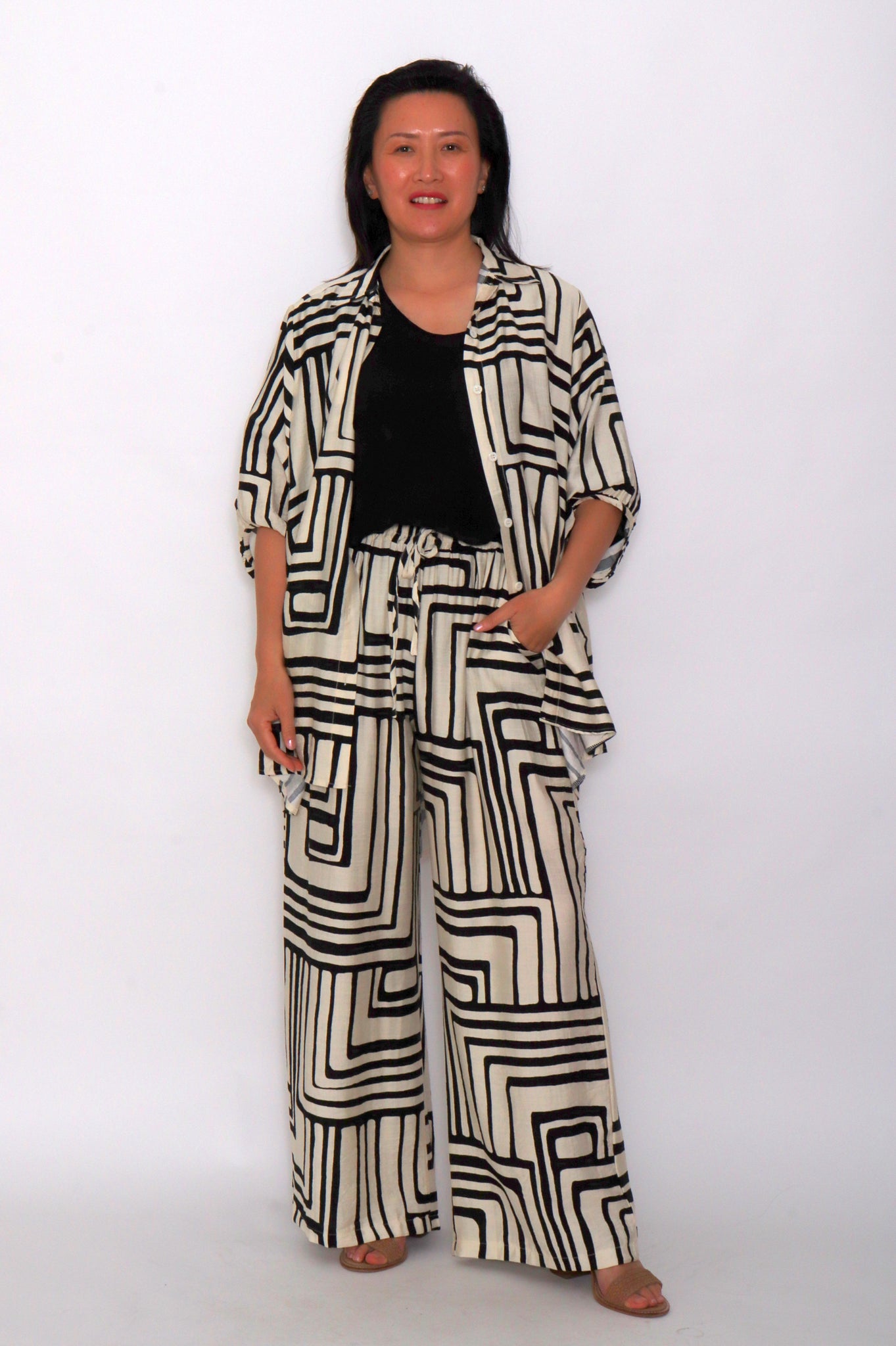 Make a statement with this modern two-piece set featuring a flowy black V-neck top paired with wide-leg trousers in a bold cream and black geometric print. The oversized silhouette and breathable fabric ensure comfort without sacrificing style, making it a versatile choice for casual days, travel, or chic weekend wear.