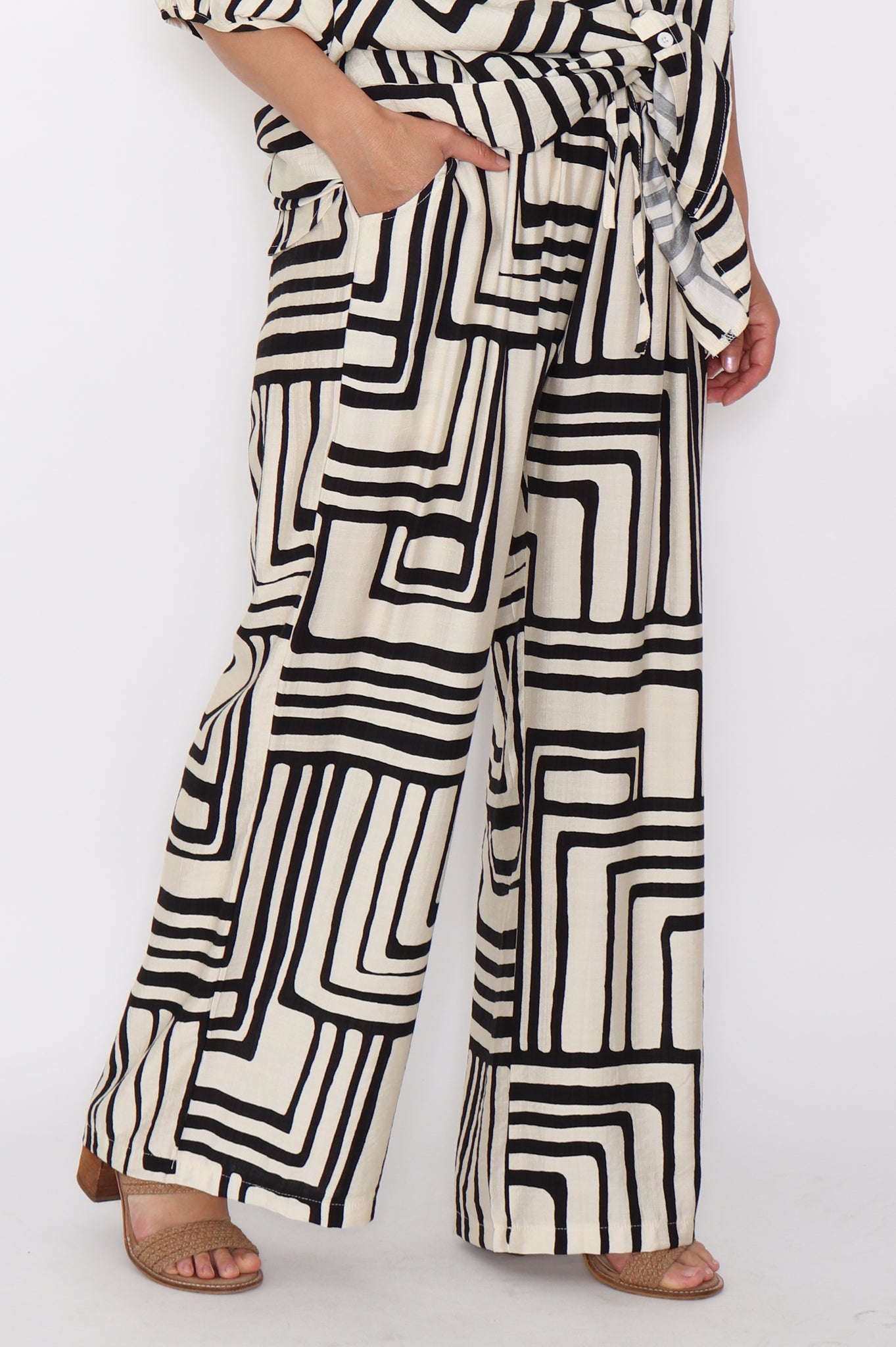 Stand out in style with these wide-leg trousers featuring a striking cream and black geometric maze print. Designed with a relaxed silhouette, an elastic waistband, and side pockets, these pants combine everyday comfort with a bold, modern look. Perfect to pair with solid tops for an effortlessly chic outfit that works for casual wear, travel, or resort days.
