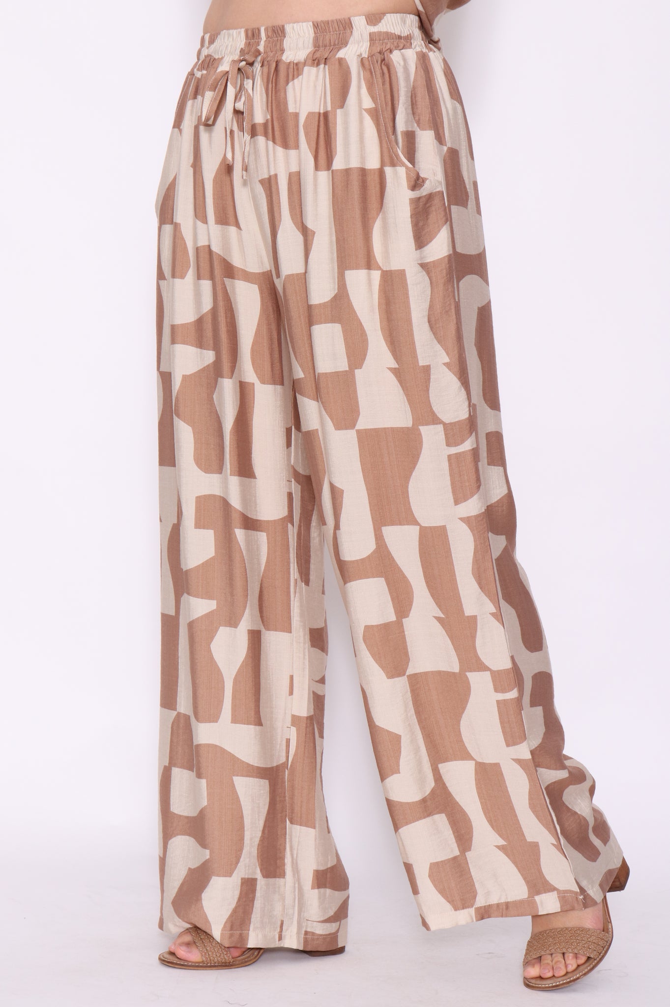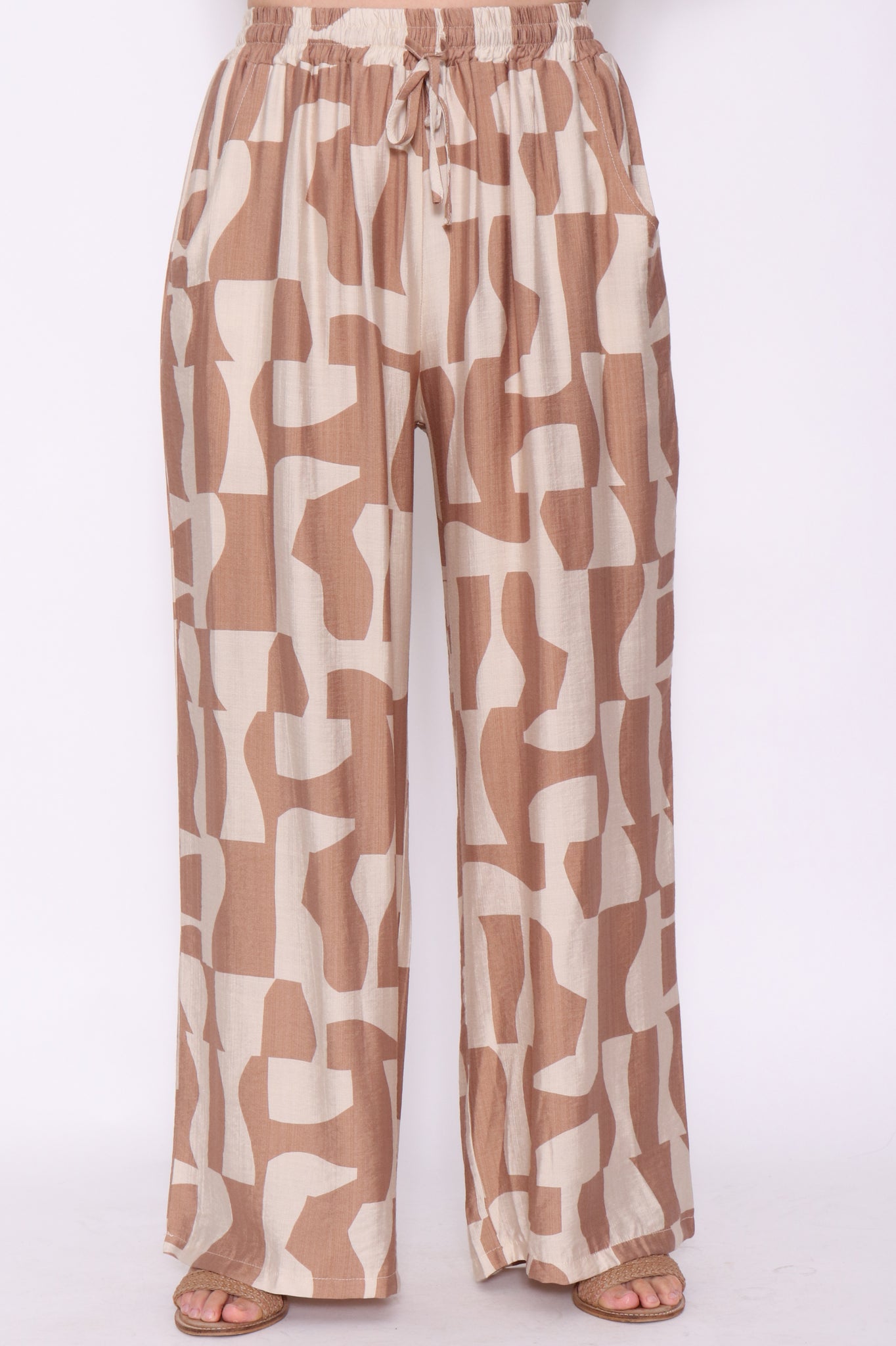 Stand out in effortless style with these wide-leg pants featuring a bold sandy beige and cream abstract print. Designed with a relaxed fit, an elastic waistband, and a drawstring tie, they offer both comfort and versatility. Side pockets add practicality, making them the perfect blend of function and fashion. Lightweight and breathable, these pants are ideal for everyday wear, travel, or a chic resort look.