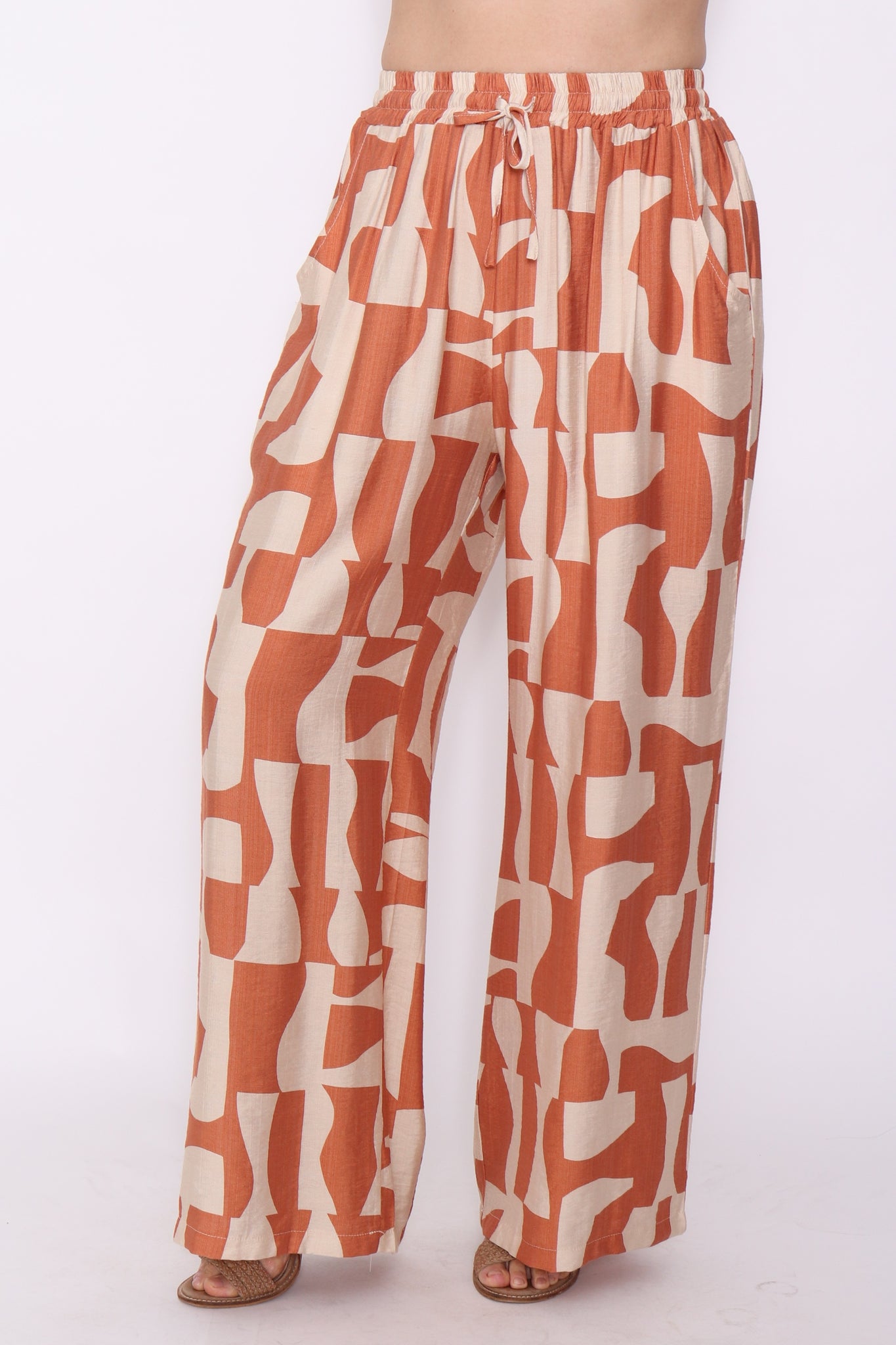 Add a bold statement to your wardrobe with these wide-leg, high-waisted pants featuring a striking rust orange and cream abstract pattern. Designed for effortless style and comfort, these pants are perfect for warm-weather wear or laid-back everyday looks.
