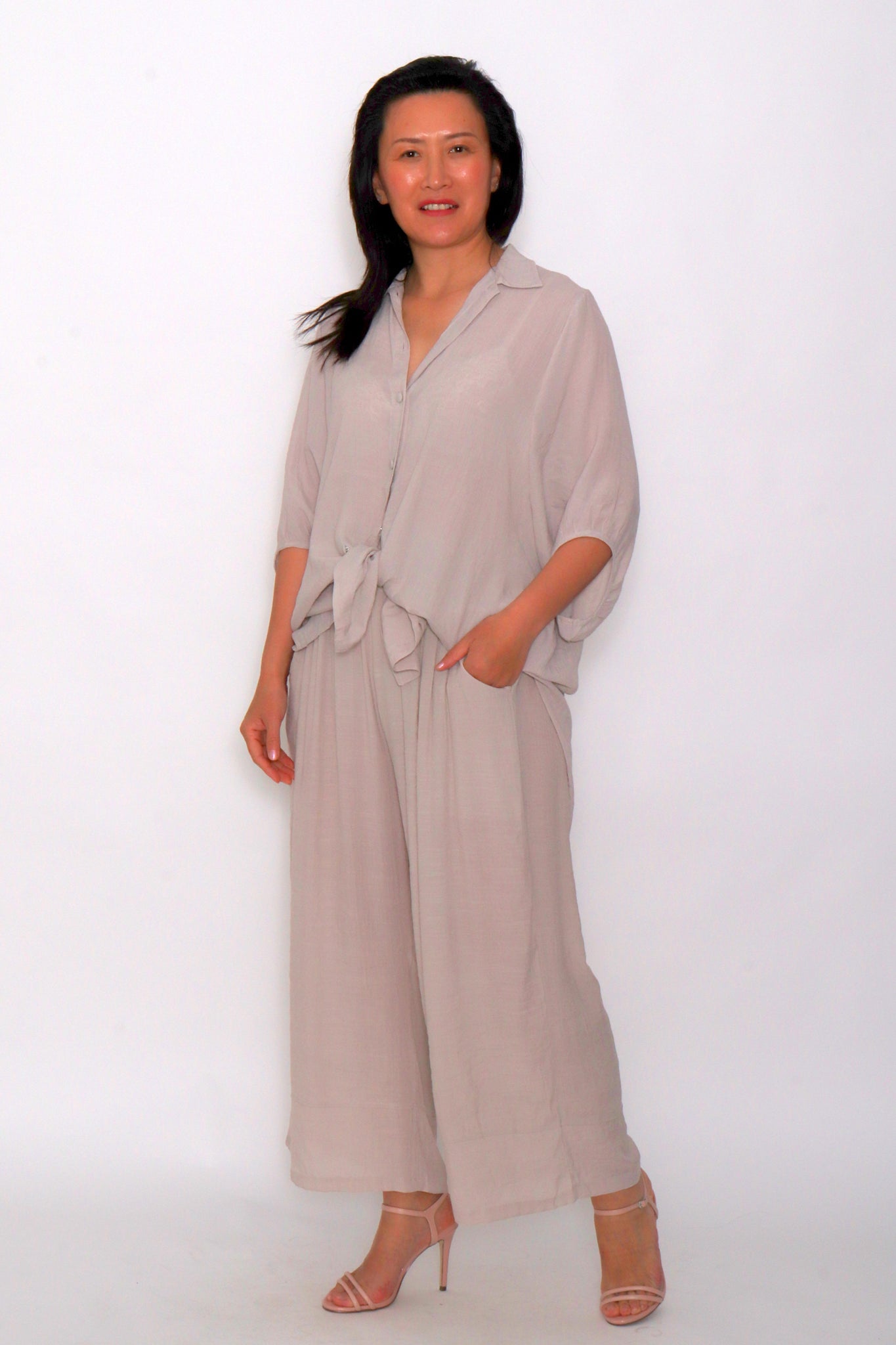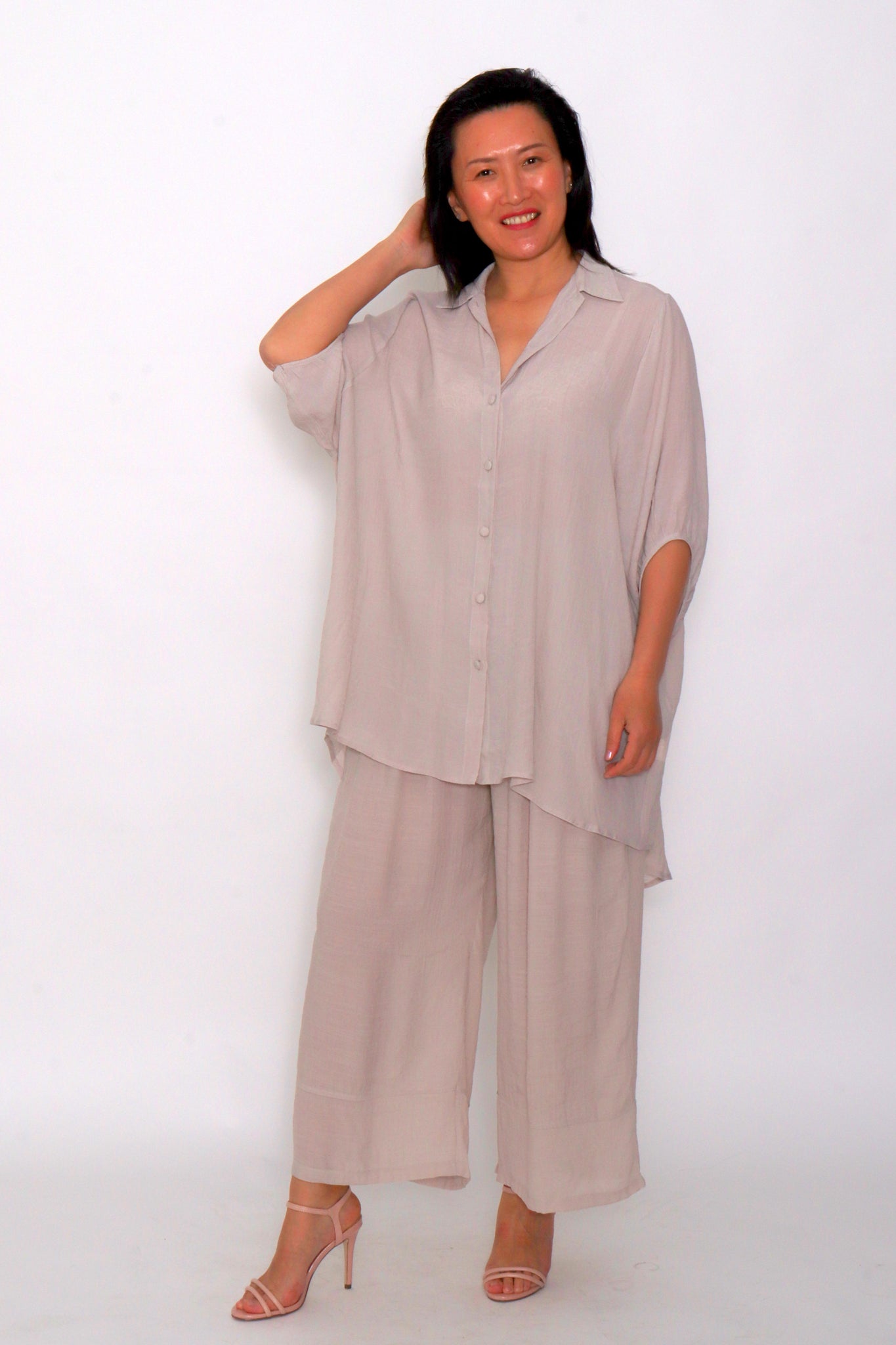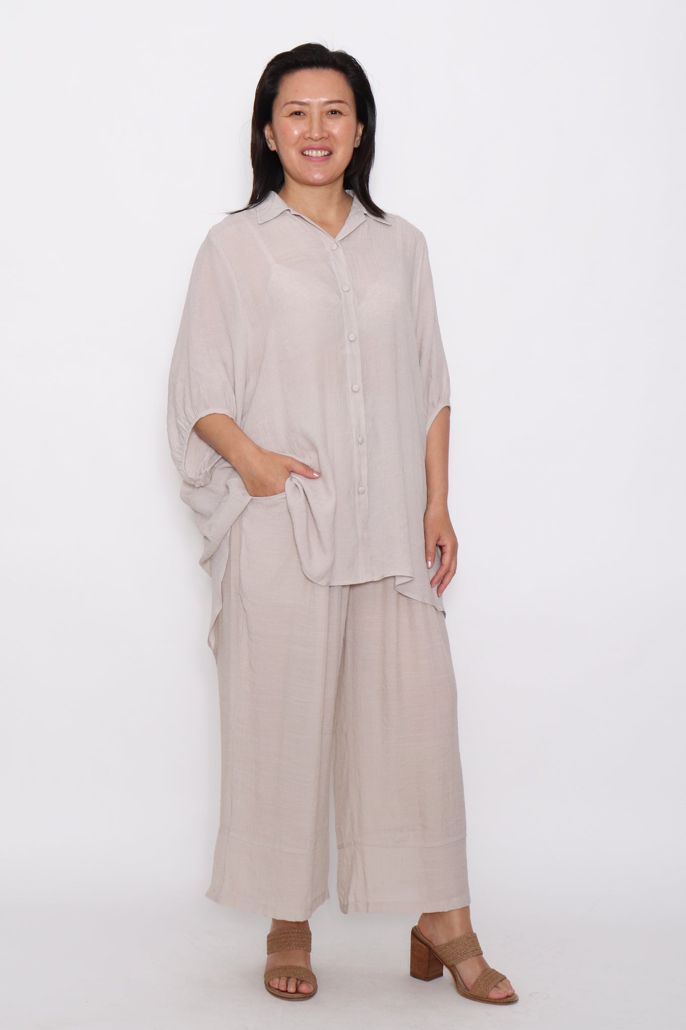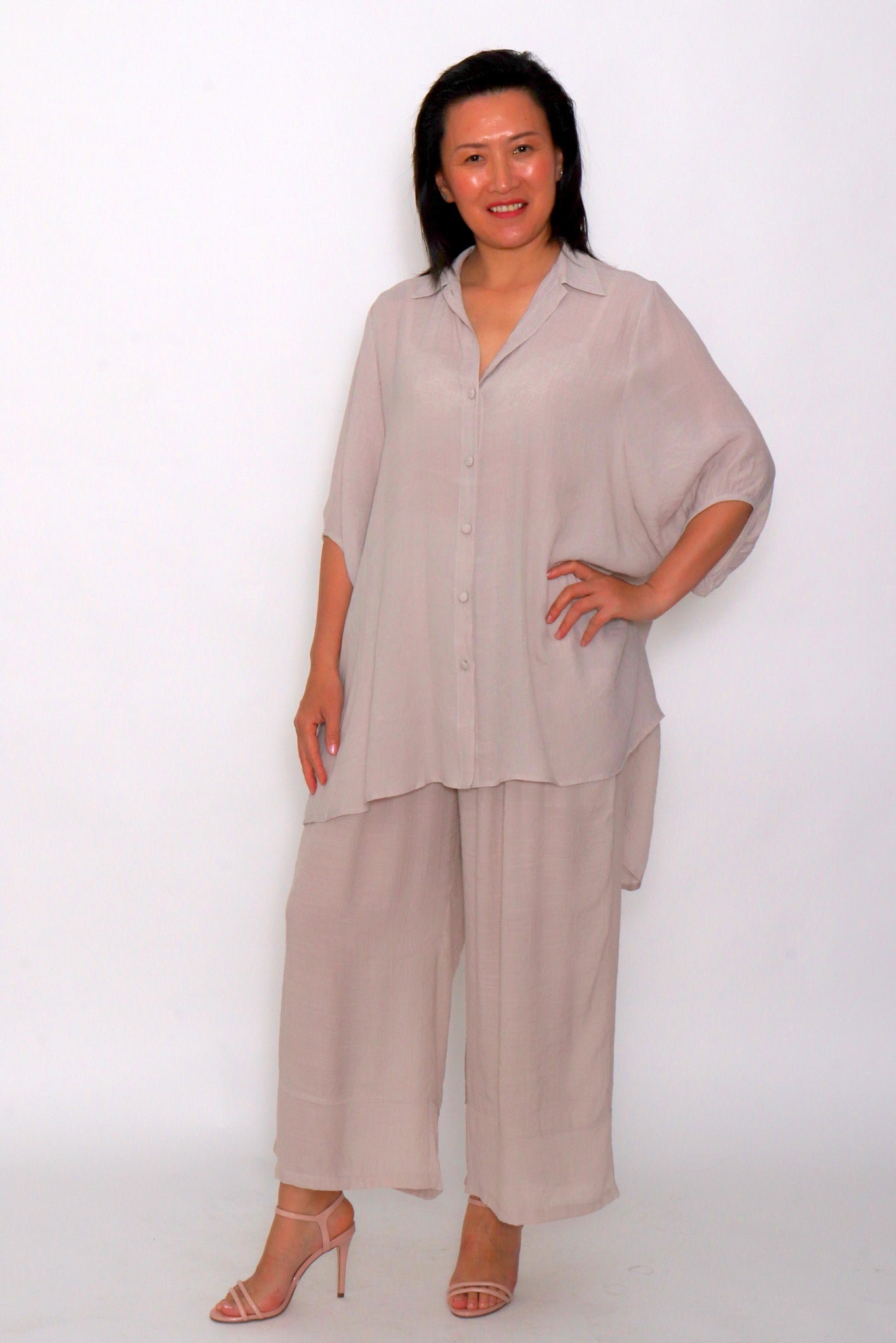 The 3/4 sleeves and high-low hem offer flattering coverage, while the breathable fabric ensures all-day wearability. Its soft taupe tone complements any outfit, whether you pair it with matching wide-leg pants for a coordinated set or style it with denim for a laid-back look.