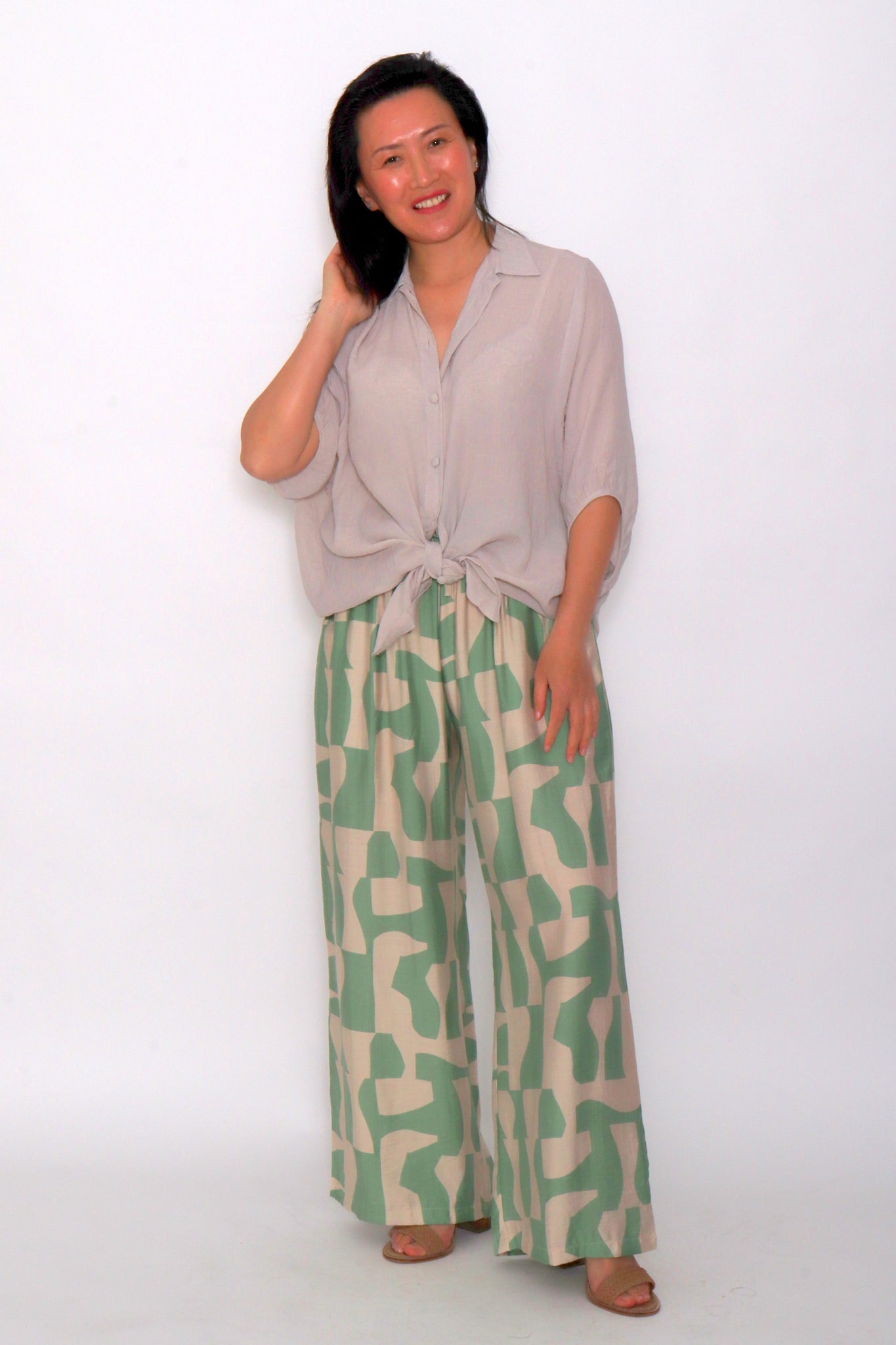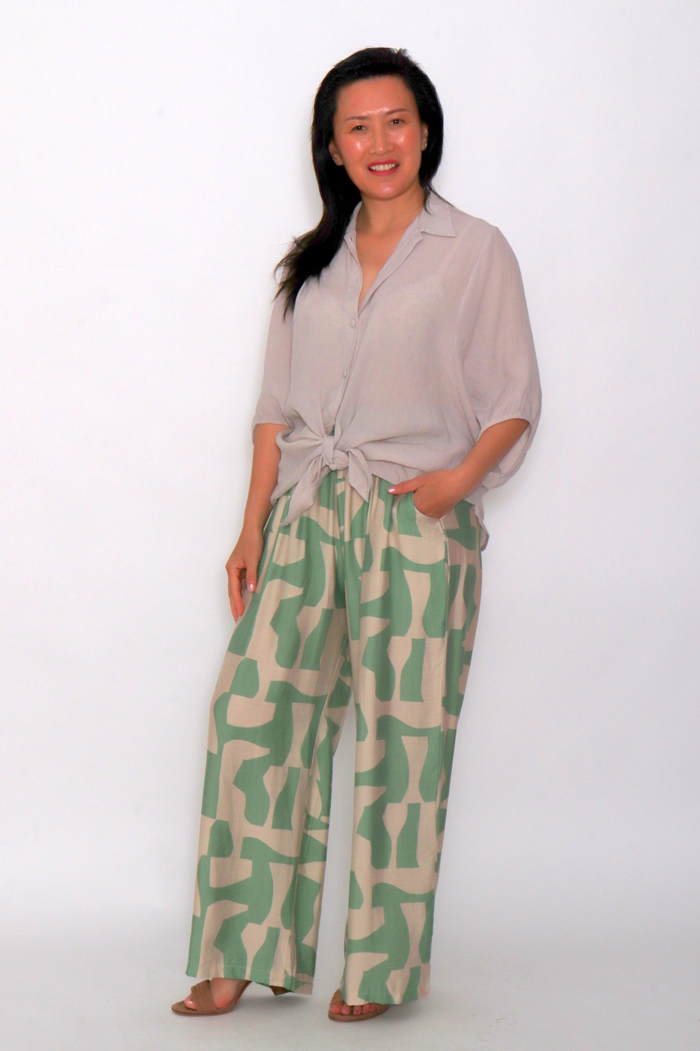 Product Name: Relaxed Abstract Print Wide-Leg Pants & Button-Down Blouse – Green & Beige Set