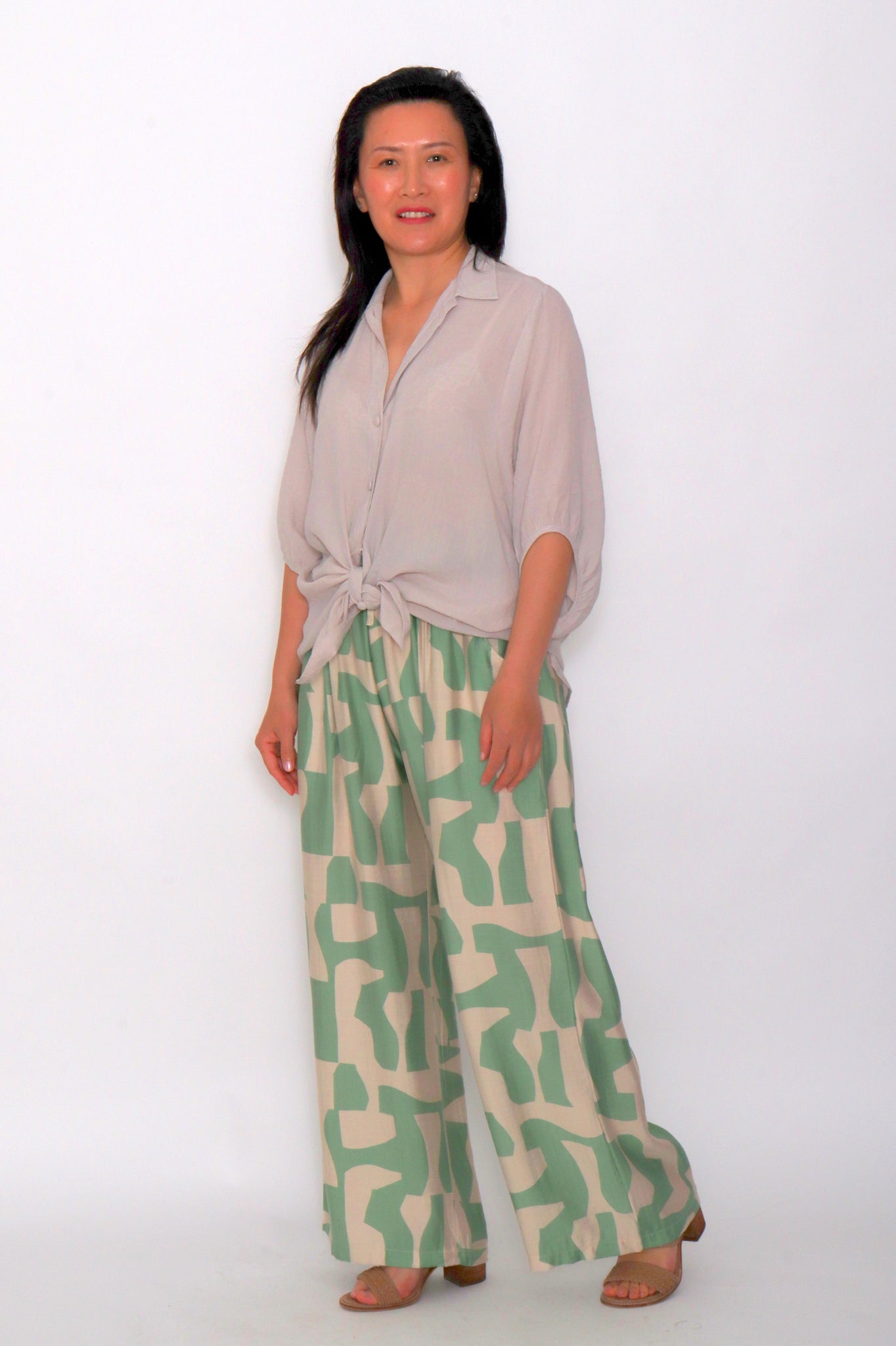This chic two-piece set is designed for effortless elegance and all-day comfort. The outfit pairs a breezy, sheer button-down blouse in soft beige with relaxed abstract print wide-leg pants in green and cream. The blouse features a flowy silhouette that can be styled tucked, loose, or tied at the waist, making it versatile for any occasion. The wide-leg trousers boast a bold geometric print with an elastic waistband and side pockets, offering both style and ease.