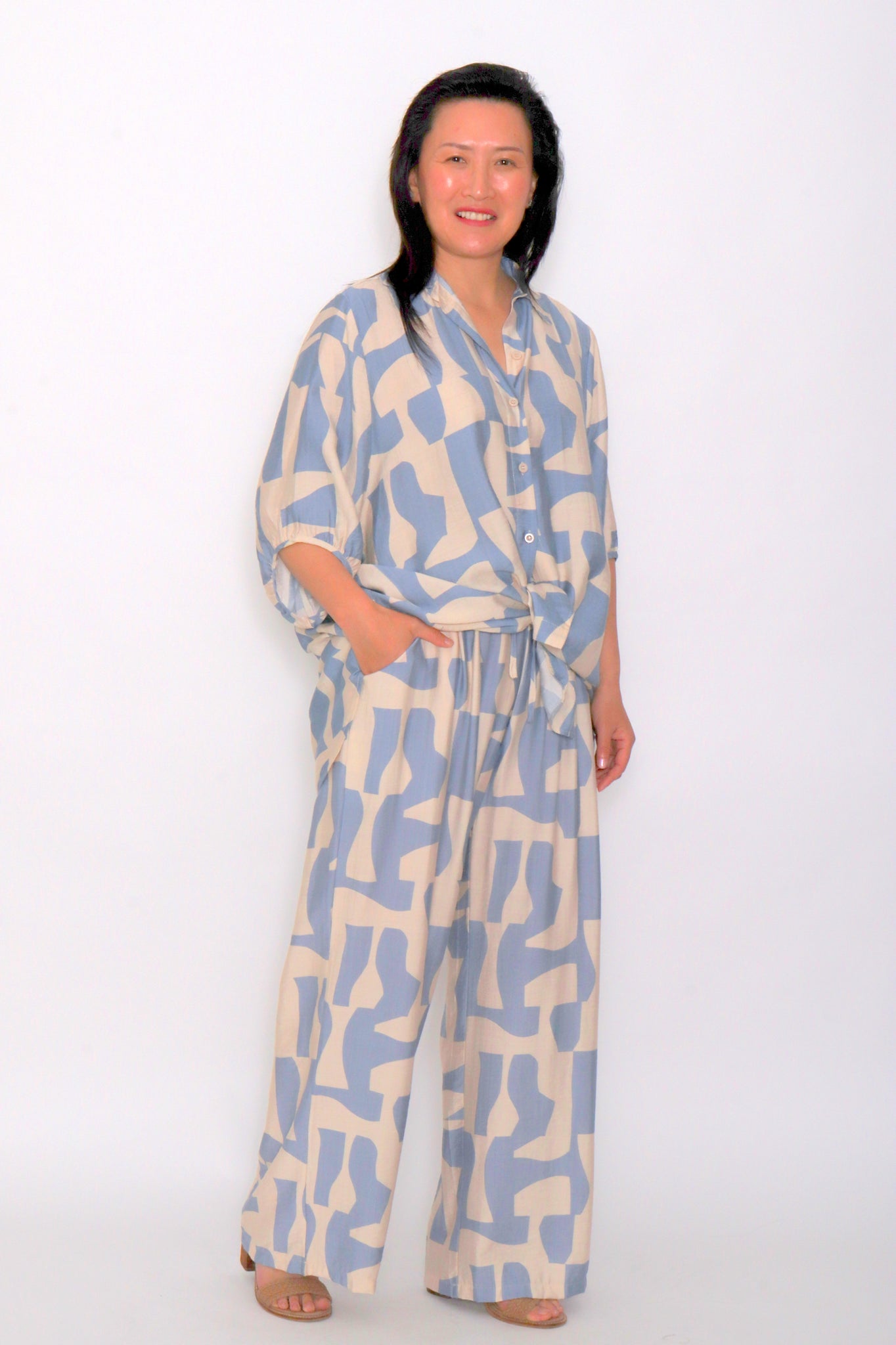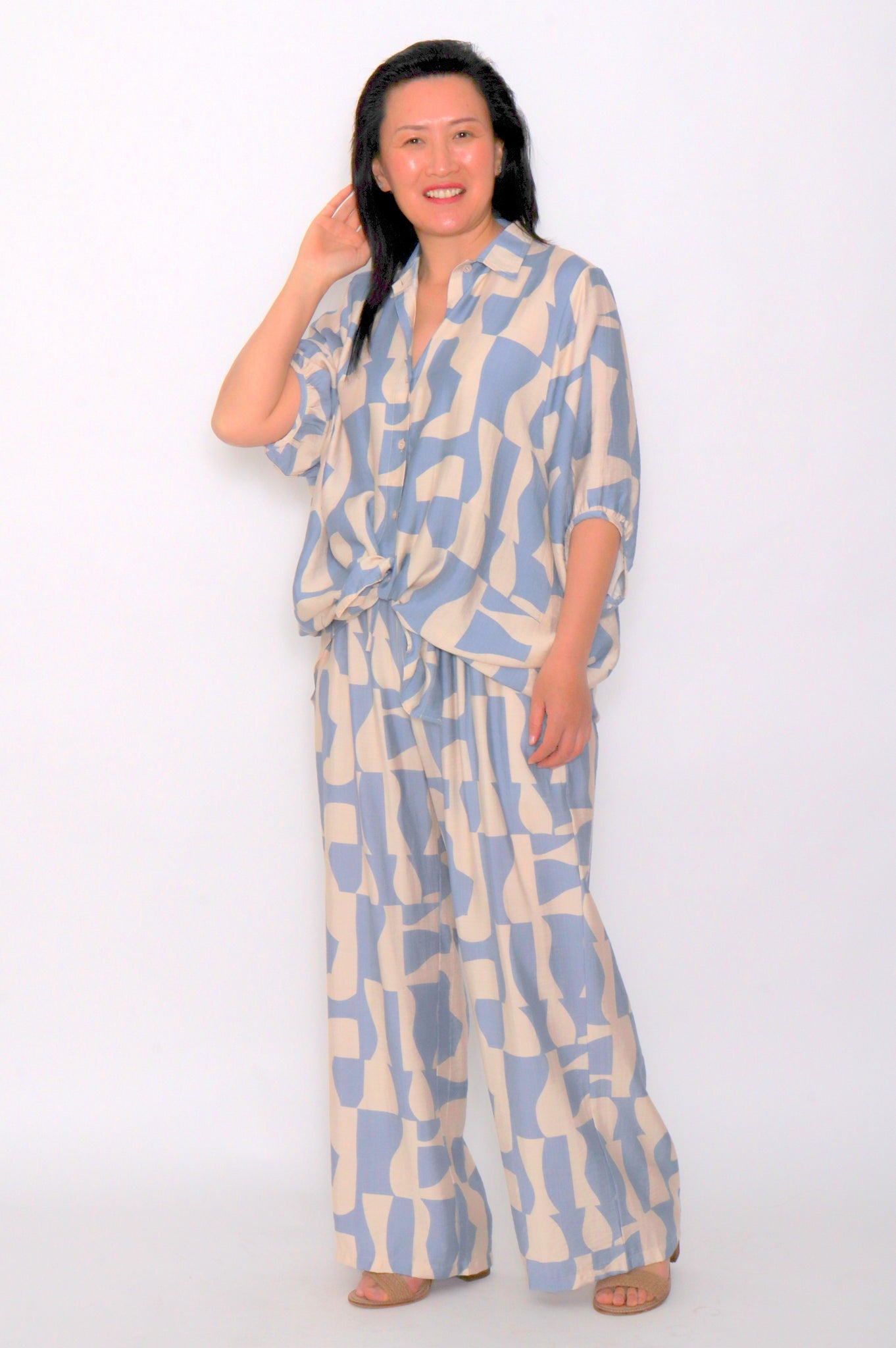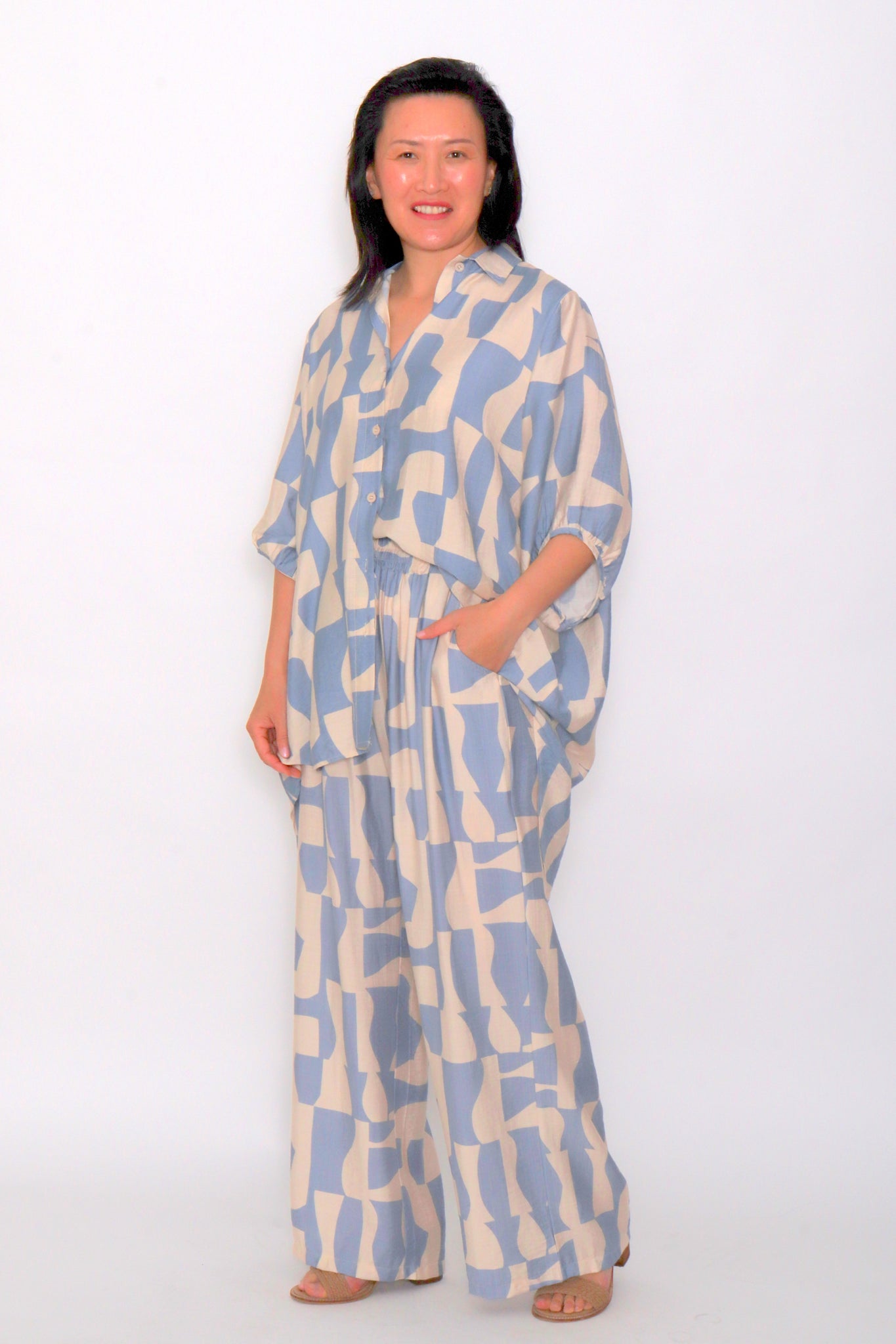 Elevate your everyday style with this modern two-piece set, designed for both comfort and chic appeal. The oversized button-down shirt showcases a striking abstract print in soft blue and cream, offering a relaxed, breezy fit that drapes beautifully. Paired with matching wide-leg pants featuring an elastic waistband and flowy silhouette, this coordinated set is perfect for effortless dressing. Whether worn together for a statement look or styled separately with wardrobe staples, it’s versatile, comfortable, and stylish.