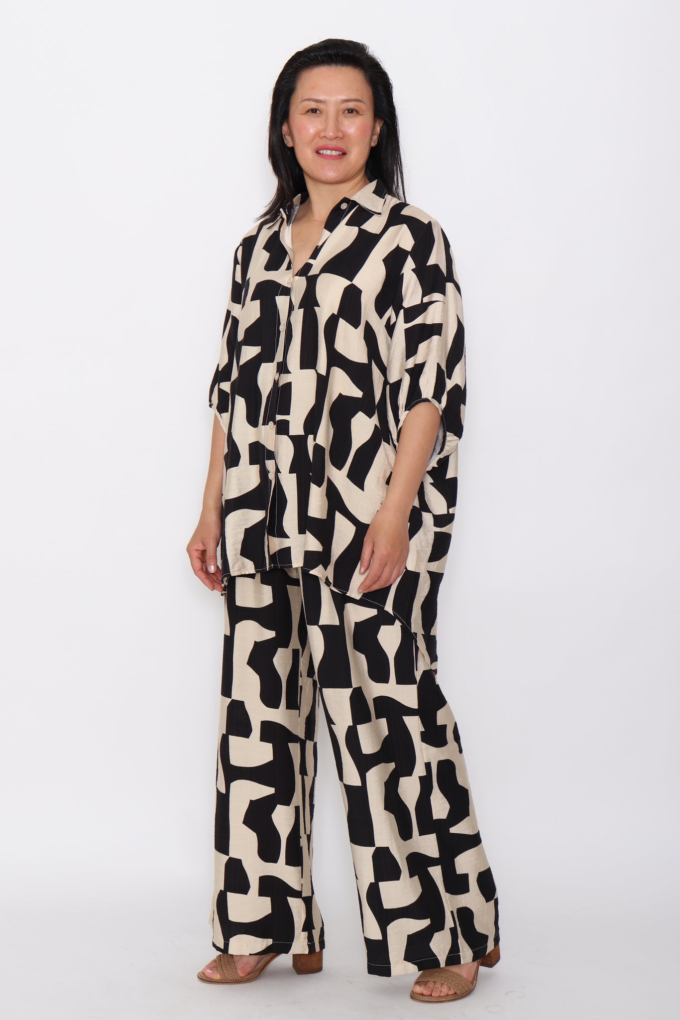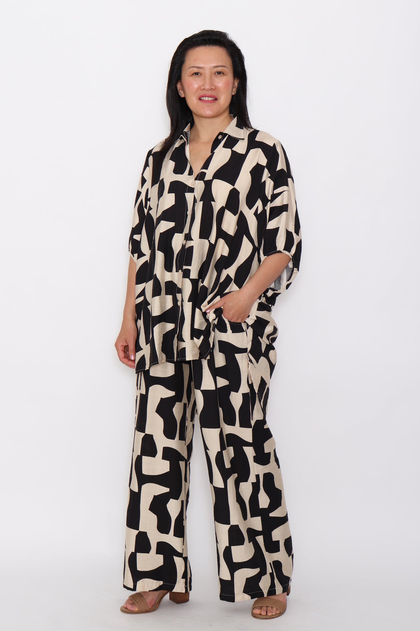 Make a bold statement with our chic Abstract Print Set, designed for effortless style and all-day comfort. This eye-catching ensemble features a relaxed, button-down shirt with a classic collar and short sleeves, paired perfectly with wide-leg trousers. The bold black and cream abstract print adds an artistic flair that transitions seamlessly from casual daywear to elevated evening looks.