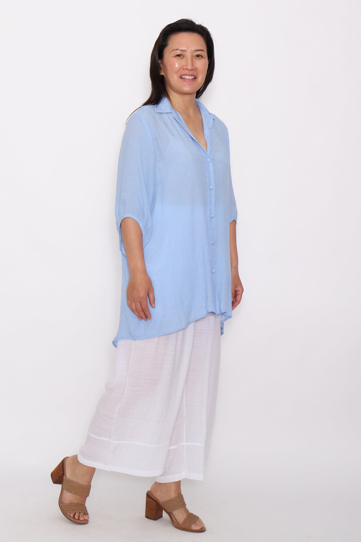 Effortlessly chic and endlessly comfortable, the Relaxed Breeze Set is your go-to for laid-back elegance. The lightweight sky-blue shirt features a flowy silhouette with a soft collar, button-down front, and asymmetrical hemline that drapes beautifully for a flattering fit. Paired with airy white wide-leg pants, this look offers breathable comfort and timeless style — perfect for warm days, travel, or casual outings.